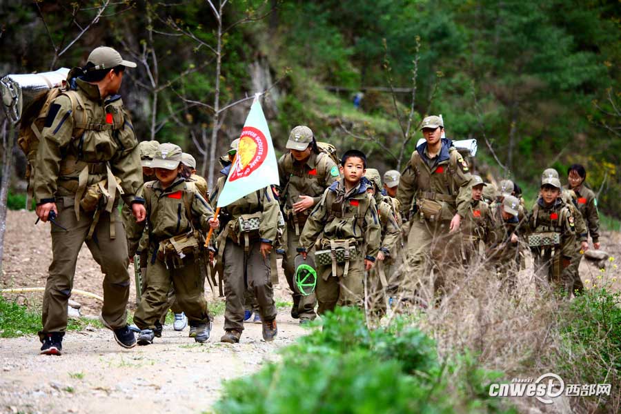 More than 20 primary school students learn outdoor skills including outdoor cooking and experience their lives in the wild in Yingpan Township, Shangluo, northwest China's Shaanxi Province on April 18, 2015. (Photo/cnwest.com)