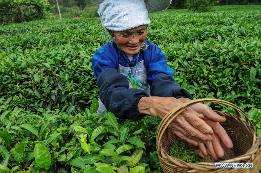 A tea farmer picks up tea leaves in Huishui County of Qiannan Buyi Autonomous Prefecture, southwest China's Guizhou Province, April 25, 2015. Tea farmers here are busy with picking up the last batch of spring tea leaves. (Xinhua/Ou Dongqu)