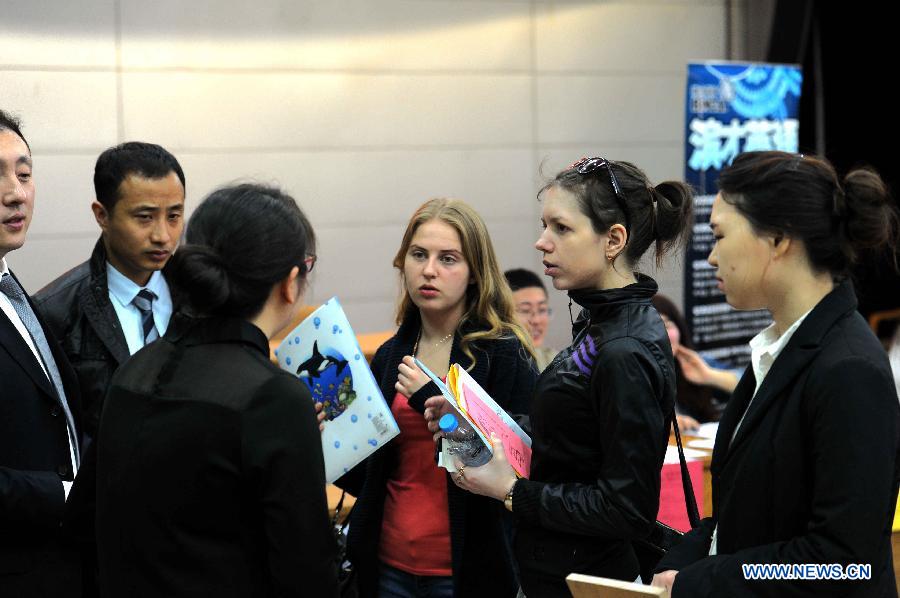 Foreign graduates talk with recruiters at a job fair especially held for foreign students in Heilongjiang University in Harbin, capital of northeast China's Heilongjiang Province, April 25, 2015. More than 200 foreign graduates from ten countries tried to find a job at the fair. (Xinhua/Wang Song)