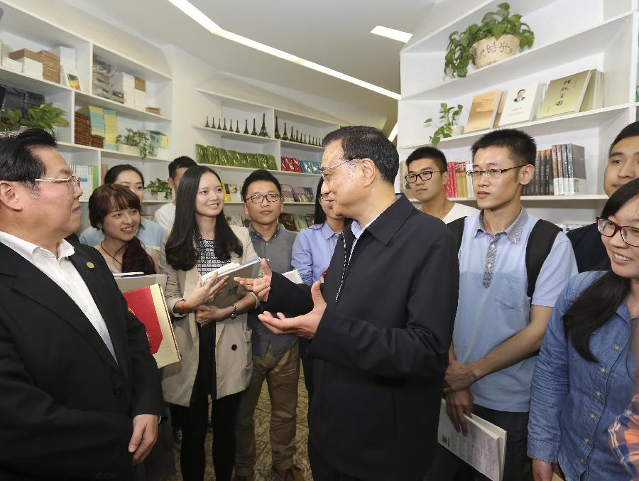 Chinese Premier Li Keqiang talks with students at a campus bookstore of Xiamen University in Xiamen, southeast China's Fujian Province, April 22, 2015. Li visited cities of Xiamen, Quanzhou and Fuzhou of Fujian province from April 22 to 24. (Xinhua/Ding Lin)