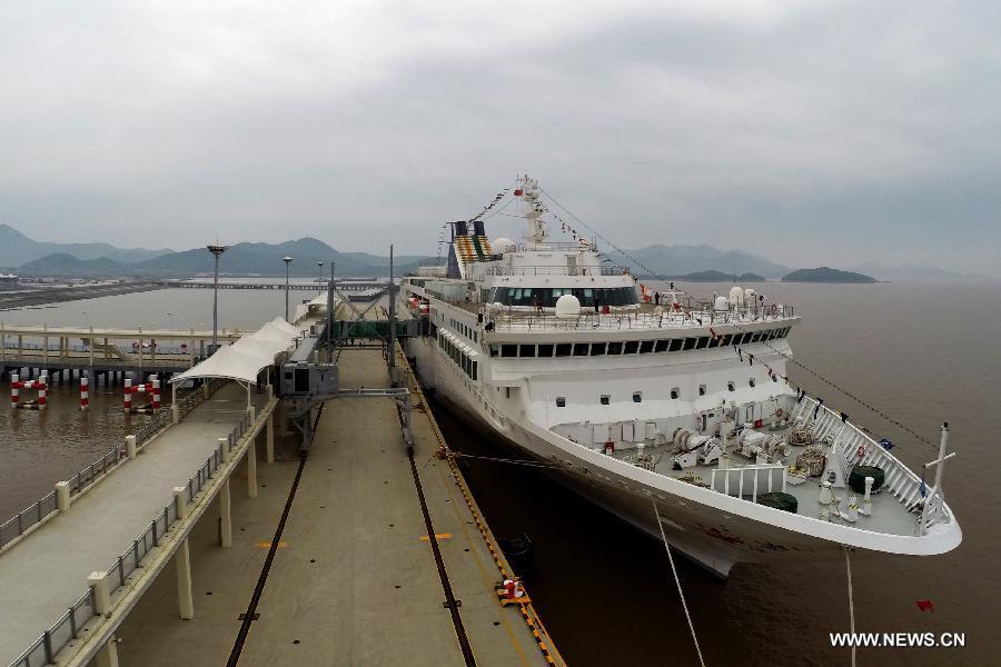 Passenger liner Chinese Taishan docks at a port in Zhoushan, east China's Zhejiang Province, April 24, 2015. A new route linking Zhoushan and southeast China's Taiwan was officially launched on Friday, as nearly 900 passengers started their journey to Taiwan from Zhoushan by the passenger liner named as Chinese Taishan. (Xinhua/Yao Feng)