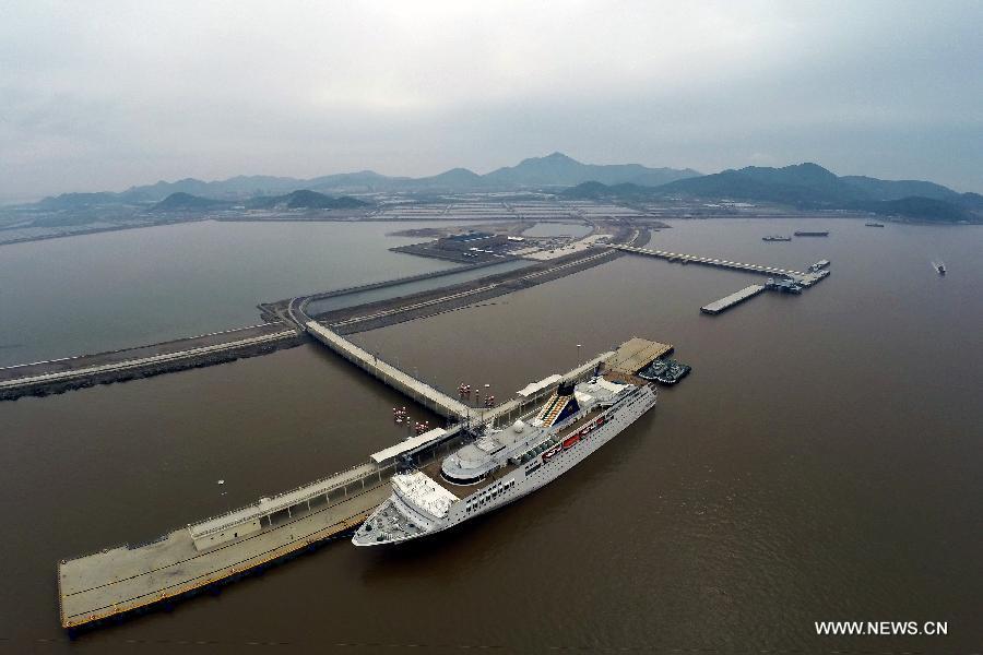 | Passenger liner Chinese Taishan docks at a port in Zhoushan, east China's Zhejiang Province, April 24, 2015. A new route linking Zhoushan and southeast China's Taiwan was officially launched on Friday, as nearly 900 passengers started their journey to Taiwan from Zhoushan by the passenger liner named as Chinese Taishan. (Xinhua/Yao Feng) |