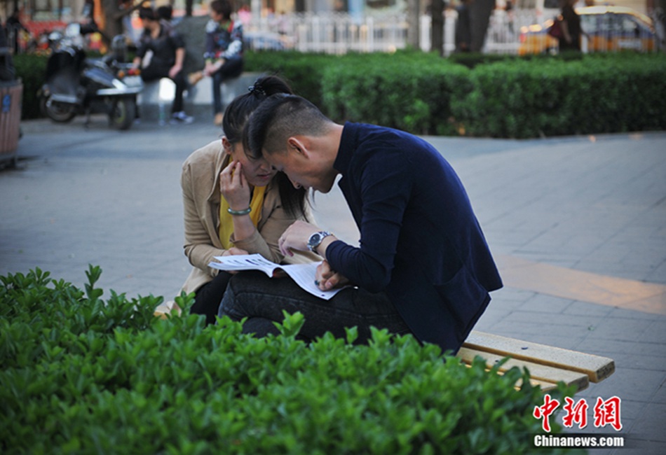 Xiao Zhang and his girlfriend read books by the road in Xisi, Beijing on April 21, 2015. (CNS/Li Peiyun)