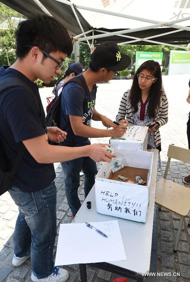A Chinese student donates money to help the people affected by Nepal earthquake, at Nanjing University of Aeronautics and Astronautics, east China's Jiangsu Province, April 26, 2015. The death toll in Nepal has exceeded 2,150 including at least 700 killed in capital Kathmandu and about 5,460 others have been wounded, National police spokesman Kamal Singh Bam said on Sunday. (Xinhua/Sun Can)