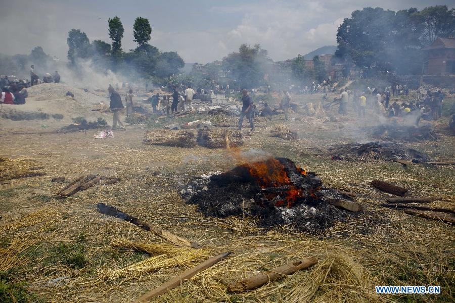 Photo taken on April 26, 2015 shows bodies of victims cremated in Bhaktapur, Nepal. A total of 3,218 people were killed and about 6,500 others injured in the powerful earthquake that struck Nepal on Saturday, the authorities said April 27. (Xinhua/Pratap Thapa)