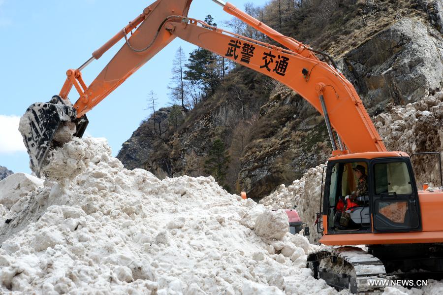 A navvy of armed traffic police repairs a snowslide affected road to quake-hit Jilung County in Xigaze City, southwest China's Tibet Autonomous Region, April 27, 2015. A 8.1-magnitude quake shook Nepal at 2:11 p.m. (Beijing Time) on Saturday, killing at least 3,218 people. The quake also strongly affected parts of Tibet, adjacent to Nepal. (Xinhua/Chen Tianhu)