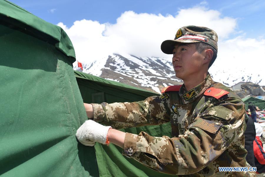 A soldier sets up makeshift tents at a middle school in Nyalam County in Xigaze, southwest China's Tibet Autonomous Region, April 26, 2015. Death toll in southwest China's Tibet Autonomous Region from the earthquake that struck neighboring Nepal on Saturday has climbed to 18. A total of 55 people there were injured, according to the regional disaster relief headquarters. (Xinhua/Zhang Quan)