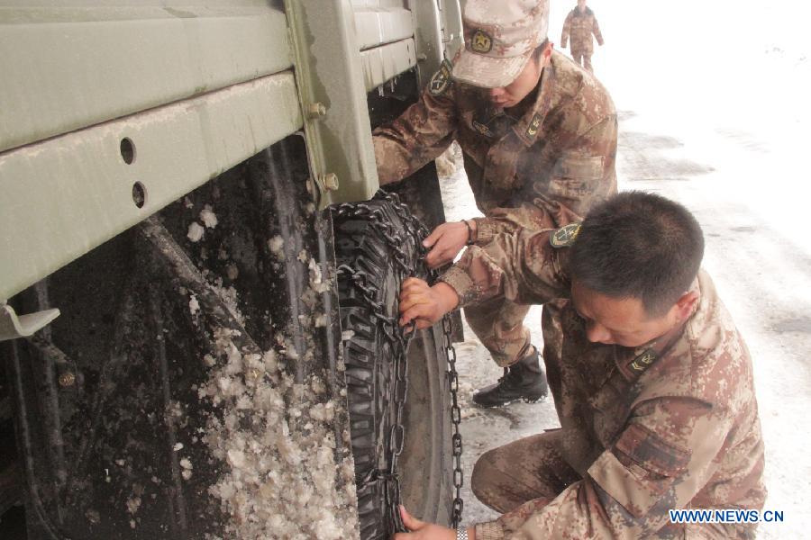 | Soldiers mount tyre chains on a heavy truck carrying relief materials in southwest China's Tibet Autonomous Region, April 26, 2015. China is mobilizing all kinds of resources from rescue teams to relief supplies to the earthquake-hit Tibet Autonomous Region and the neighboring Nepal on the other side of the world's highest mountain. (Xinhua/Li Yuanhua) |
