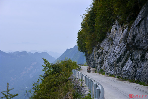 In the mountains of west Hubei province, there is a steep mountain road dug up by the locals. People call the road a “sky road” as it hangs above the mountain if they look at it from afar. (Xinhua/Song Wen)
