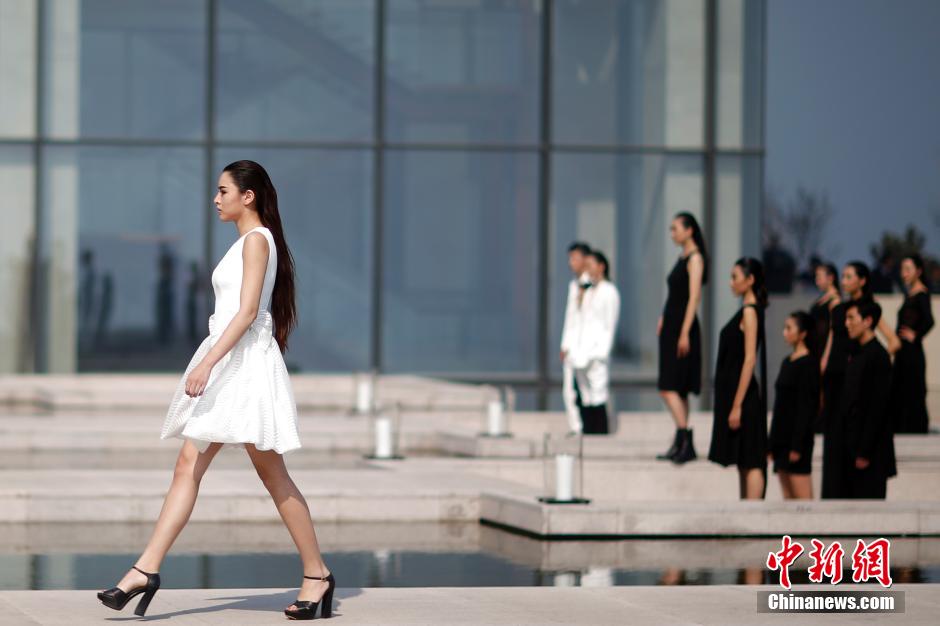 Models present creations of Taiwan designer Gioia Pan in an outdoor show of the 2015 Qingdao Fashion Week on April 26, 2015. (Chinanews/Sheng Jiapeng)