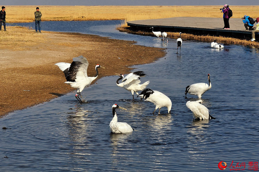 | The red-crowned crane is a beautiful and precious bird. According to statistics, by the end of 2010, there were only 1,500 red-crowned cranes in the world and 1,000 of them would spend the winter in China. In Zhalong wetland in Qiqihar, northeast China’s Heilongjiang province, a nature protection area has been established to better protect the red-crowned crane. (Photo source: people.cn) |