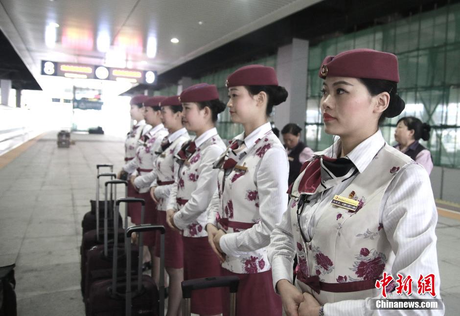 Stewardesses wait for the bullet train D2278.(Photo/Chinanews.com)