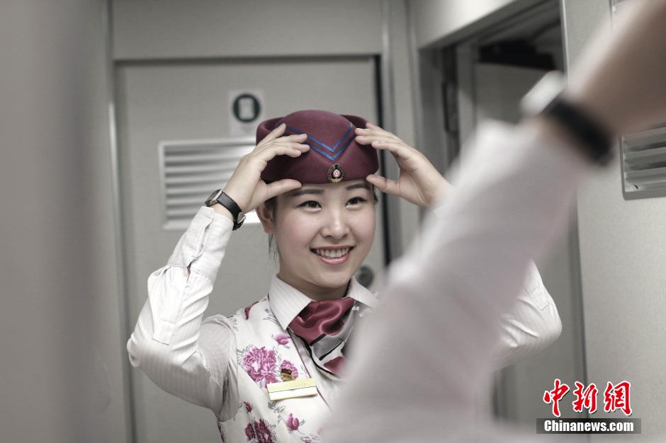 A stewardess checks her dress.(Photo/Chinanews.com)