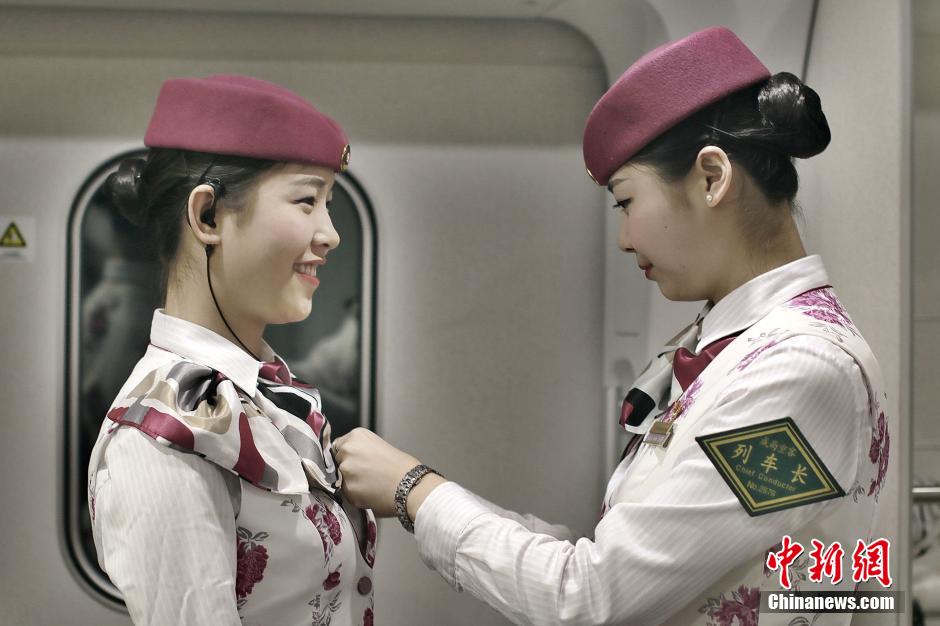 Stewardesses help each other to dress decently.(Photo/Chinanews.com)