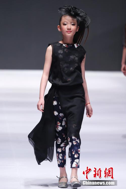 The cute child models present the clothes designed by Gui Long, a well-known fashion design house in Qingdao, east China's Shandong Province on April 26, 2015. At the 2015 Qingdao Fashion Week, Gui Long launched British-style clothing for children. (Chinanews.com/Sheng Jiapeng)