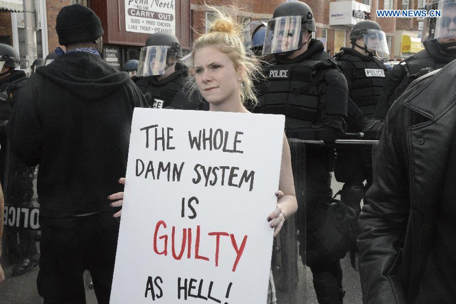 | A protester holds a banner on North Ave in Baltimore, Maryland, the United States, April 28, 2015. U.S. President Barack Obama said on Tuesday there was no excuse for that kind of violence that occurred in Baltimore in the past days, calling for the country to do some "soul searching" as the race-related riots convulsed the largest city of U.S. State of Maryland. (Xinhua/Lu Jiafei) |