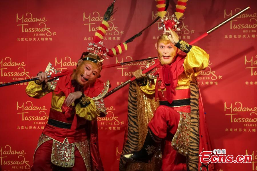 Zhang Jinlai (L), better known by his stage name Liu Xiao Ling Tong, poses with a Monkey King wax figure at Madame Tussauds wax museum in Beijing, April 29, 2015. The Chinese actor is best known for his role as the Monkey King in the 1986 television series "Journey to the West." "Journey to the West," also known as "The Monkey King," written by Wu Cheng'en in the 16th century, is one of the Four Great Classical Novels of Chinese literature. It tells the story of the legendary pilgrimage of Tang dynasty Buddhist monk Xuanzang, who traveled to the "Western Regions," or India in modern terms, to obtain sacred texts while encountering numerous challenges. (Photo: China News Service/Xiong Ran)