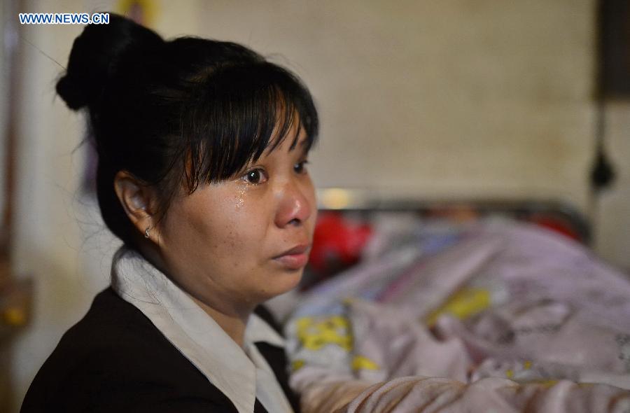 Photo taken on April 28, 2015 shows tears course down cheeks of Xu Yuelian when talking about her vegetative husband Yang Zubin at their house in Jishui County, east China's Jiangxi Province. Yang Zubin and Xu Yuelian, both 34 years old, are a couple in Nanpo Village of Huangqiao Township in Jishui County of Jiangxi Province. Yang survived a severe traffic accident and ended up in vegetative state in 2012. Though being beset by perils, Xu didn't give up on her husband and her family. With Xu's utmost care, Yang opened his eyes and regained some of his consciousness in 2014, which is rare in such circumstances. The couple who have shared weal and woe are still hoping for miracles to happen. (Xinhua/Zhou Mi)