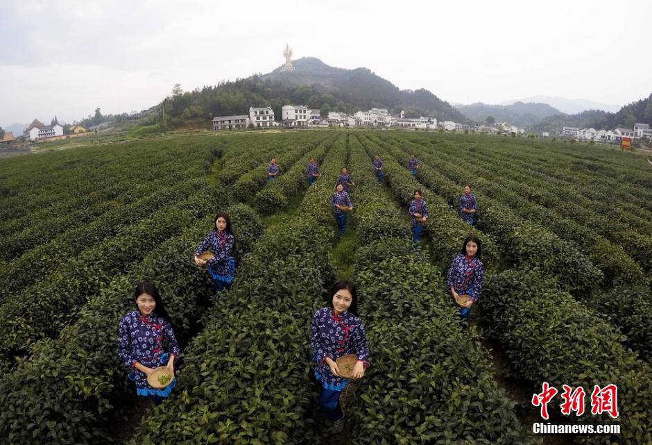 Models dressed in cheongsams pick the tea leaves in a tea plantation in Mount Wei, central China's Hunan province on the Monday. (Chinanews.com/Yang Huafeng)