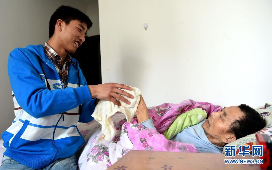Guo Shijun(R) washes his father in the temporary home on April 8, 2015. (Xinhua/Liu Junxi)
