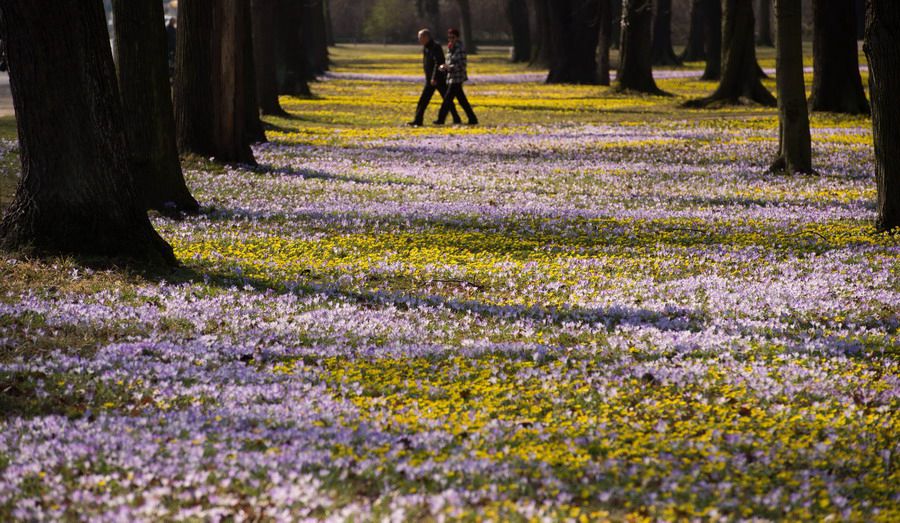 People walk on grass full of flowers in Dresden, Germany, on March 9, 2015. (Xinhua/AFP)