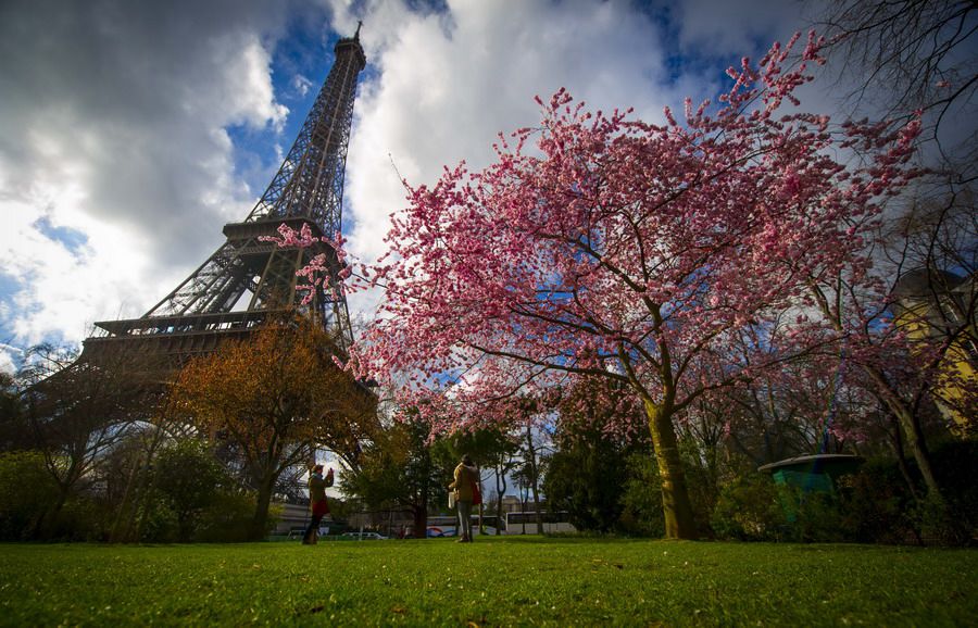 Tourists take photos under the Eiffel Tower in Paris on March 28, 2015. (Xinhua/Chen Xiaowei)