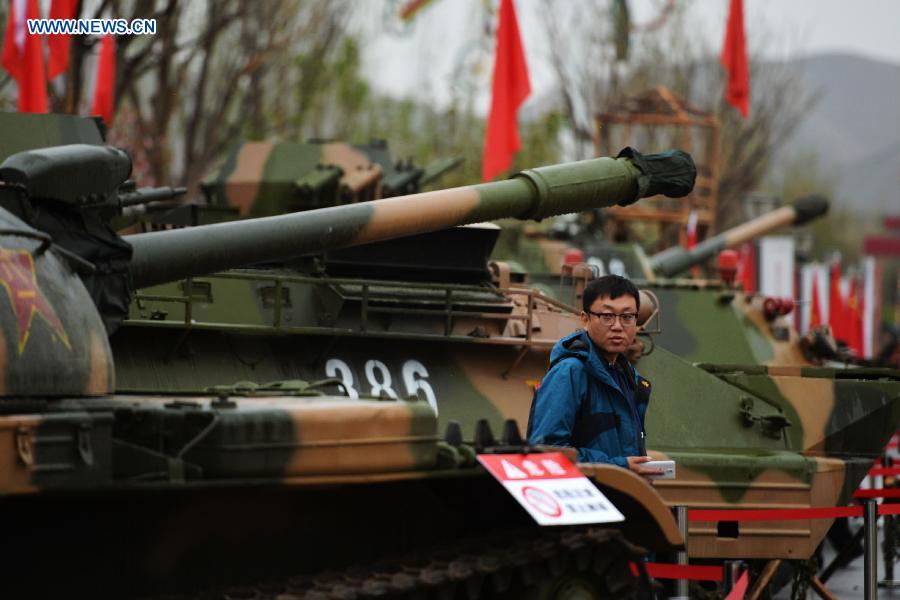A man views the displayed weapons during the 2015 northwest defense and weapon industry exhibition in Lanzhou, capital of northwest China's Gansu Province, April 30, 2015. The exhibition will last until May 17. (Xinhua/Chen Bin)