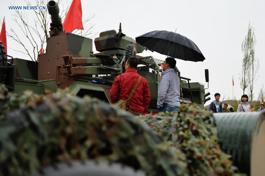 People view the displayed weapons during the 2015 northwest defense and weapon industry exhibition in Lanzhou, capital of northwest China's Gansu Province, April 30, 2015. The exhibition will last until May 17. (Xinhua/Chen Bin)