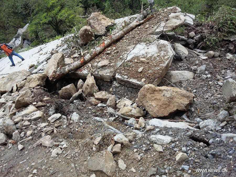 | Photo taken on May 1, 2015 shows a damaged road in Rasuwa, Nepal. (Xinhua/Sunil Sharma) |