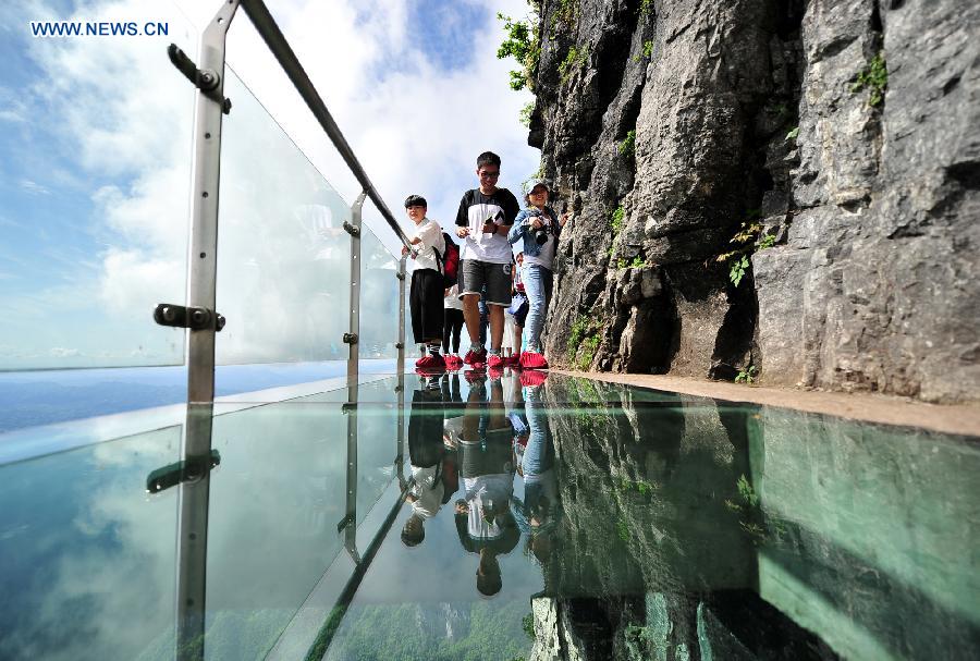 Tourists walk on a pavement built with glass on the cliff at the national forest park in Tianmen Mountain in Zhangjiajie, central China's Hunan Province, May 2, 2015. Many tourists come to experience the glass pavement built on the cliff of Tianmen Mountain with an altitude of about 1,430 meters during the May Day holiday. (Xinhua/Shao Ying)