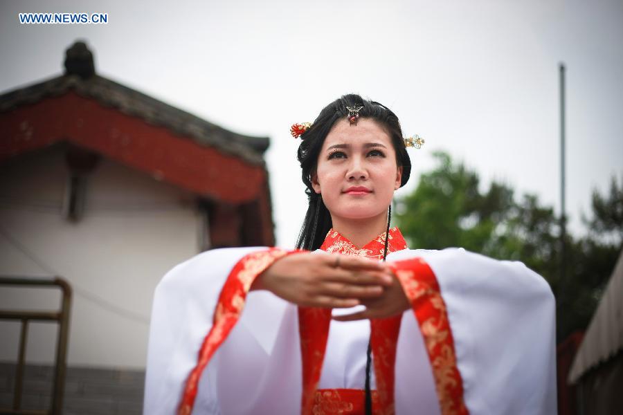 A model displays the Hanfu, or Han dress, in Mang Dang Mountain Han Culture Tourism Area in Yongcheng City of central China's Henan Province, May 2, 2015. Hanfu is the traditional dress of the Han Chinese people. (Xinhua/Zheng Huansong)