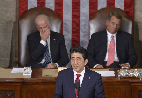 Japanese Prime Minister Shinzo Abe (C) addresses a joint meeting of Congress on Capitol Hill in Washington D.C., the United States, April 29, 2015. (Xinhua/Yin Bogu)