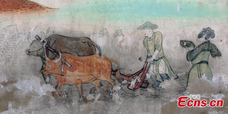 Dunhuang Research Academy has released a series of photos of grotto paintings that depict work scenes, such as farming, on WeChat, a popular social networking app, during the three-day May Day holiday. The academy is an institution responsible for conservation, management and research at the Mogao Grottoes (a World Cultural Heritage site at Dunhuang), the Yulin Grottoes (a nationally protected key cultural heritage site at Guazhou), and the Western Thousand-Buddha Grottoes at Dunhuang. (Photo provided by Dunhuang Research Academy)