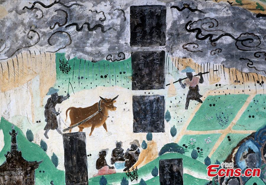 Dunhuang Research Academy has released a series of photos of grotto paintings that depict work scenes, such as farming, on WeChat, a popular social networking app, during the three-day May Day holiday. The academy is an institution responsible for conservation, management and research at the Mogao Grottoes (a World Cultural Heritage site at Dunhuang), the Yulin Grottoes (a nationally protected key cultural heritage site at Guazhou), and the Western Thousand-Buddha Grottoes at Dunhuang. (Photo provided by Dunhuang Research Academy)
