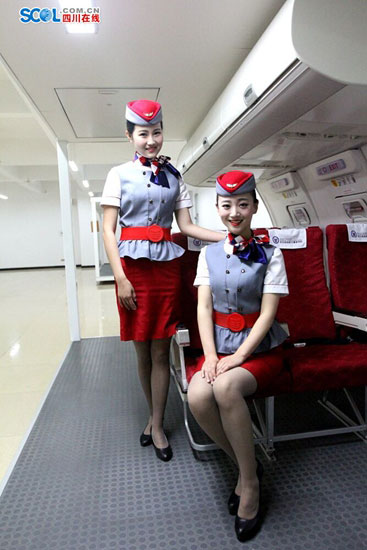 Two pairs of twin sisters are trained to be cabin attendants at the Sichuan Southwest College of Civil Aviation. Yan Huihui and Yan Cuicui are twin sisters; so are Yang Zhuojun and Yang Zhuolin. They have been recruited as cabin attendants by China Southern Airliners. (SCOL.com.cn/Yang De)