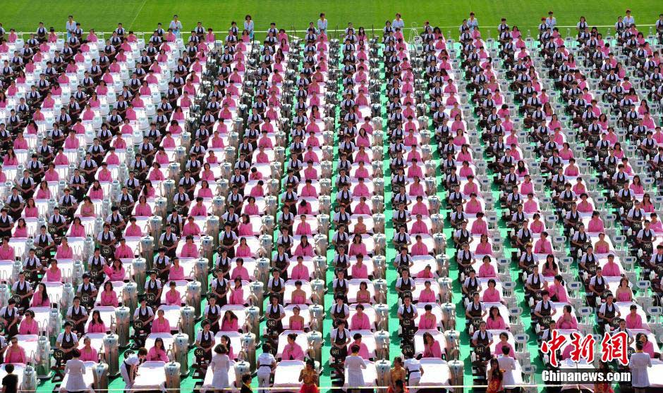 A total of 1,000 women in pink bathrobes receive free beauty treatment at a soccer field in Jinan, capital of east China's Shandong province, May 4, 2015. 1,000 beauticians offered the facial treatments at the same time; successfully set a new Guinness World Record. (CNS/Zhang Yong)