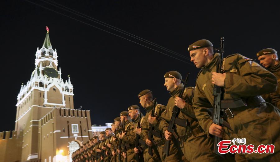 Russian military vehicles including the new Russian T-14 Armata tank make their way to Red Square during a rehearsal for the Victory Day military parade which will take place at Moscow's Red Square on May 9 to celebrate 70 years after the victory in WWII, in Moscow, Russia, May 4, 2015. About 200 pieces of military hardware and 16,500 troops will take part in the parade on Red Square. (Photo provided to China News Service)