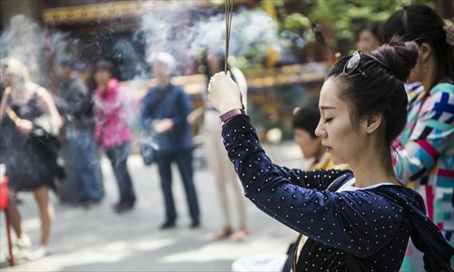 A woman prays at a temple in Beijing. (Photo: Li Hao/GT)