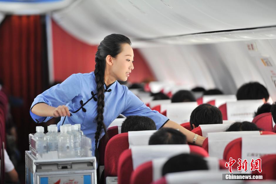 On the fight from Kunming to Sanya, Lucky Air stewardesses dressed in vintage school uniforms celebrate the Youth Day on May 4, 2015. (CNS/ Liu Ranyang)