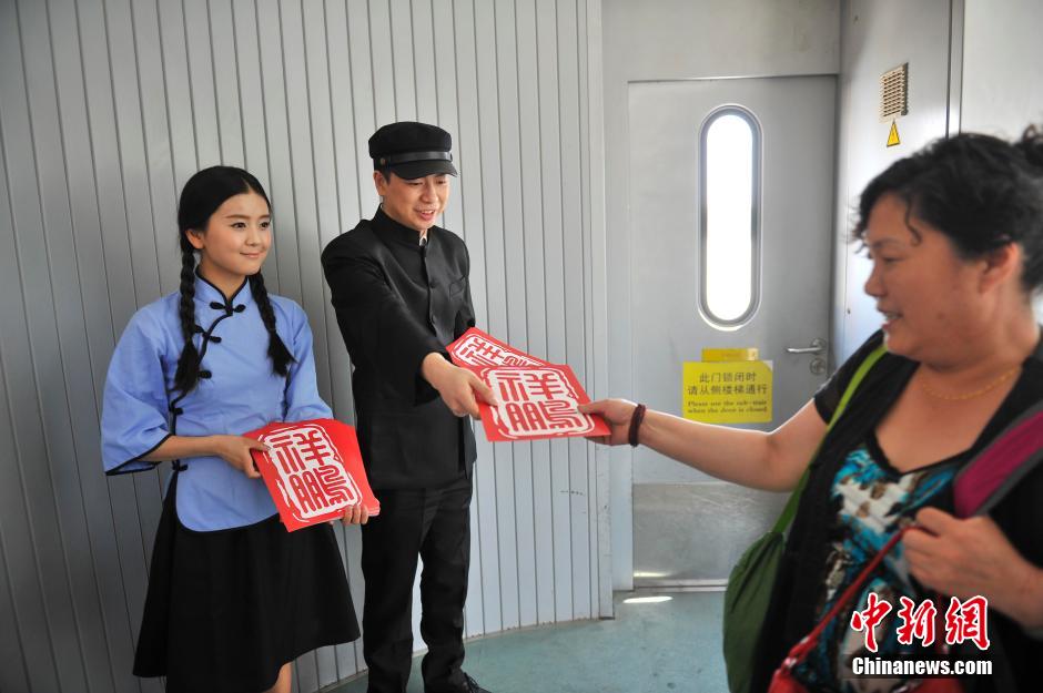 On the fight from Kunming to Sanya, Lucky Air stewardesses dressed in vintage school uniforms celebrate the Youth Day on May 4, 2015. (CNS/ Liu Ranyang)
