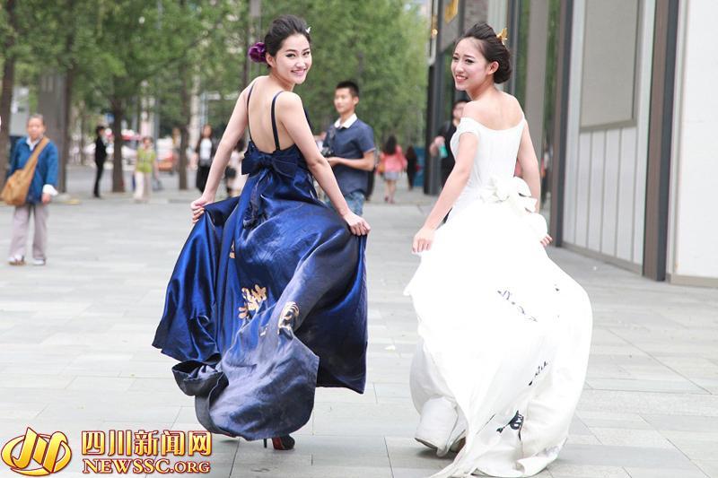 More than 20 future flight attendants stage a flash mob show in Chengdu, capital of southwest China's Sichuan province, May 3, 2015. (Photo/newssc.org)