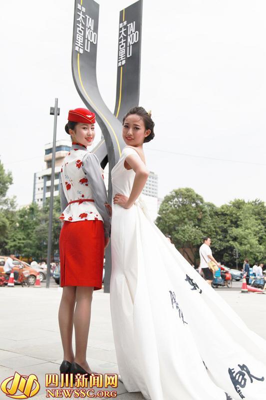 More than 20 future flight attendants stage a flash mob show in Chengdu, capital of southwest China's Sichuan province, May 3, 2015. (Photo/newssc.org)