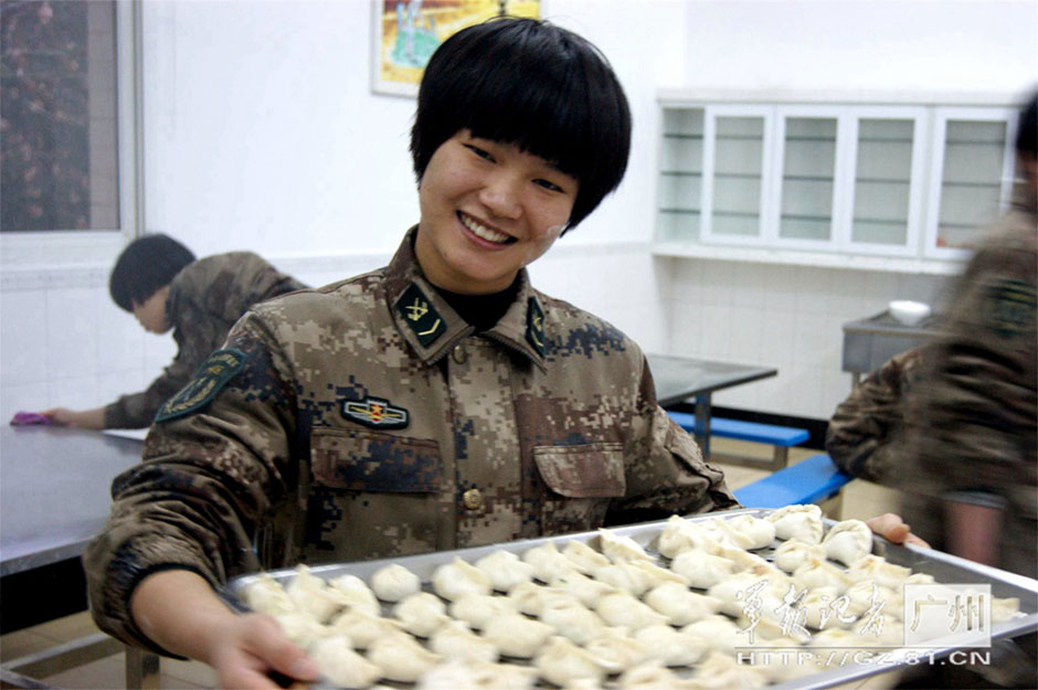 A female squad leader presents dumplings she made in the Spring Festival. (Photo/GZ.81.CN)