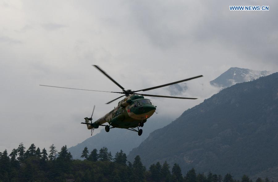 A helicopter of China's air force returns from Nepal, in Gyirong County, southwest China's Tibet Autonomous Region, May 6, 2015. Three helicopters from China's air force flew to Nepal on Wednesday morning to help with transportation and rescue. (Xinhua/Wang Shoubao)