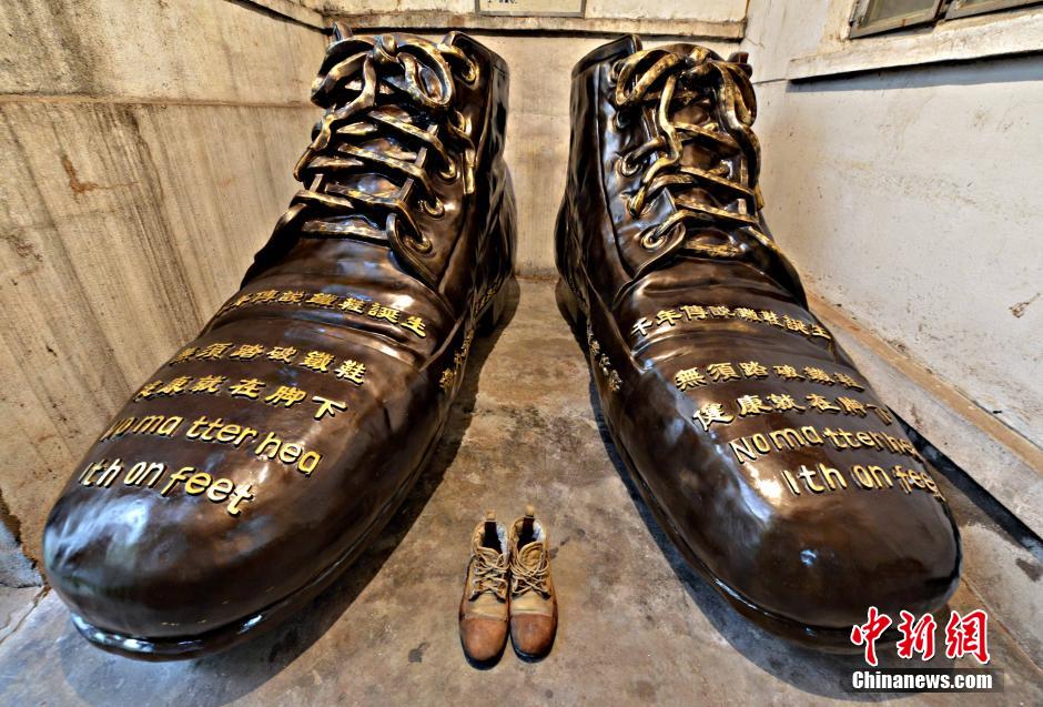 Zheng Chenggan, 67, made the world's largest copper shoes in Fuzhou city, southeast China's Fujian province. (CNS/Zhang Bin)