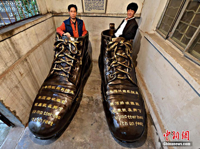 Zheng Changgan, 67, spent half a year and 180,000 yuan in making the world's largest copper shoes in Fuzhou city, southeast China's Fujian province. The pair of huge shoes is 1.3 meters high, 2.3 meters long, 0.8 meters wide and weighs 1 ton.