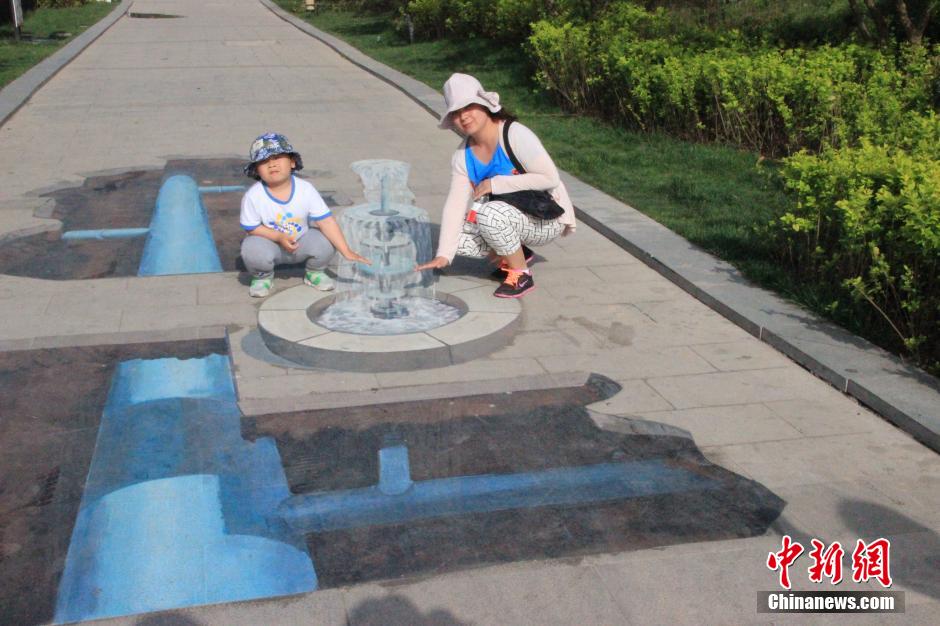 3D street paintings in Xi'an attract many people to take photos with the amazing special effects. Featuring cliff, waterfall, and trap etc., these vivid 3D paintings have become unique scenery on the street of Xi'an. (Chinanews/Fang Qin)