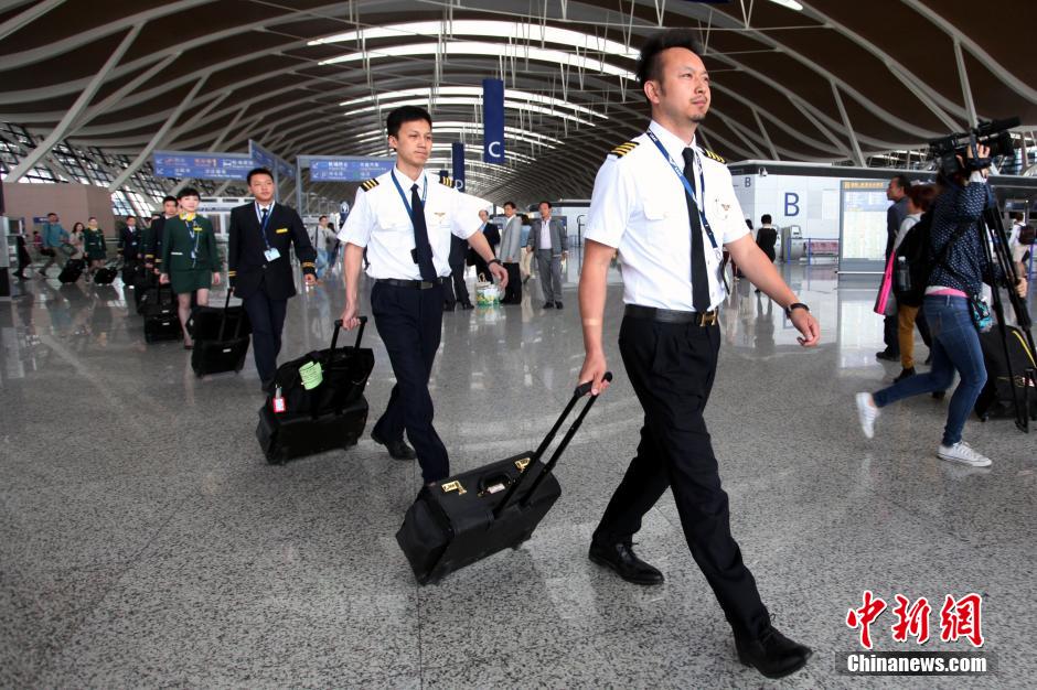 The first batch of 24 Taiwanese flight attendants, including 22 stewardesses and two stewards, appear on Flight 9C8951 of Spring Airlines from Shanghai to Taipei on May 7, 2015. This is the first time that a mainland airline has employed flight attendants from Taiwan. (CNS/Zhang Hengwei)