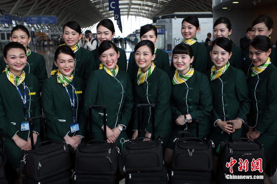 The first batch of 24 Taiwanese flight attendants, including 22 stewardesses and two stewards, appear on Flight 9C8951 of Spring Airlines from Shanghai to Taipei on May 7, 2015. This is the first time that a mainland airline has employed flight attendants from Taiwan. (CNS/Zhang Hengwei)