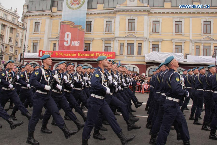 Russian soldiers take part in the military parade marking the 70th anniversary of the victory in the Great Patriotic War, in Vladivostok, Russia, May 9, 2015. (Xinhua/Alisa)